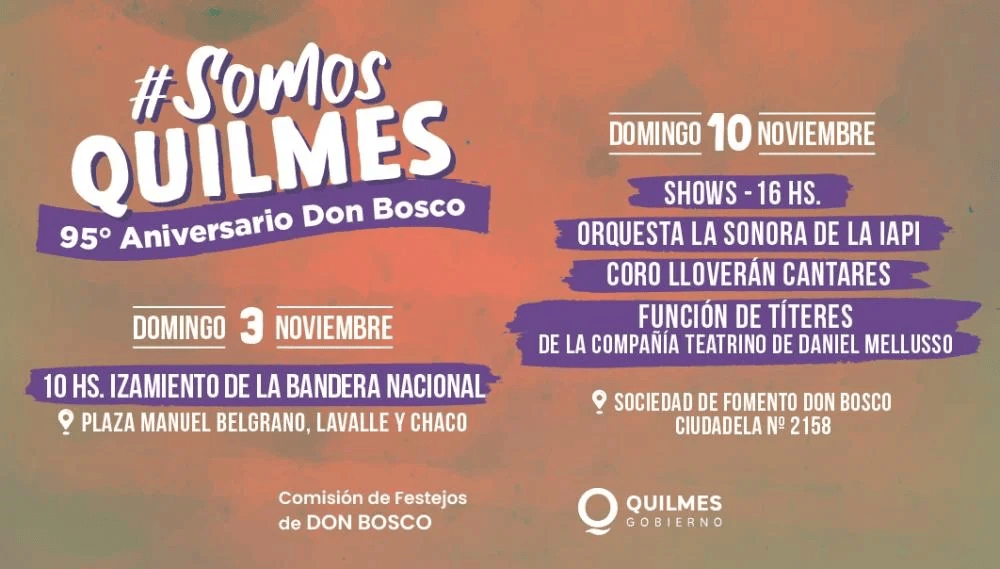 El domingo 3 de noviembre la Comisión de Festejos de las Instituciones de la Ciudad de Don Bosco invita al acto conmemorativo del 95º aniversario de Don Bosco, que se llevará adelante desde las 10, en la plaza Manuel Belgrano, ...